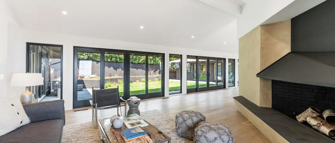 Inside, the layout was reworked to create an open and functional main living area anchored by a modern kitchen with custom cabinetry, a large island, and stone countertops. Wide-plank wood flooring, vaulted ceilings, and carefully selected lighting carry throughout the home, creating a bright and cohesive interior. Large sliding doors extend the living spaces into multiple outdoor areas, including a private courtyard and patio, making the home well suited for both everyday living and entertaining. Updated bathrooms and private bedroom spaces complete the renovation, resulting in a comfortable, move-in-ready home that reflects Stroud Development’s thoughtful approach to design and remodeling.
